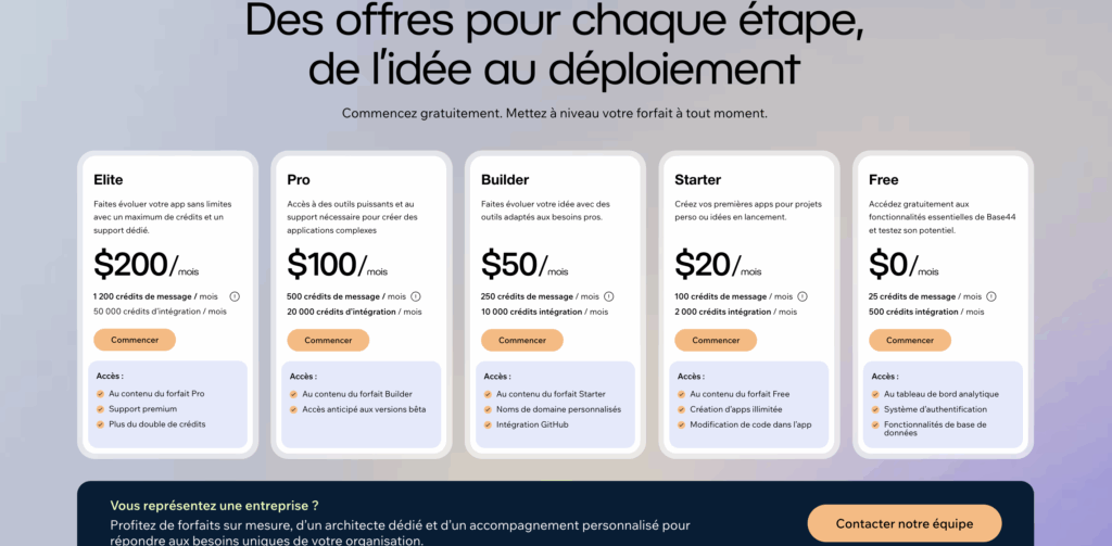 - Les plans payants démarrent autour de 20 $/mois, pour un nombre plus élevé de messages/prompts, de crédits d’intégration et de fonctionnalités avancées (domaines personnalisés, export de code, support premium).