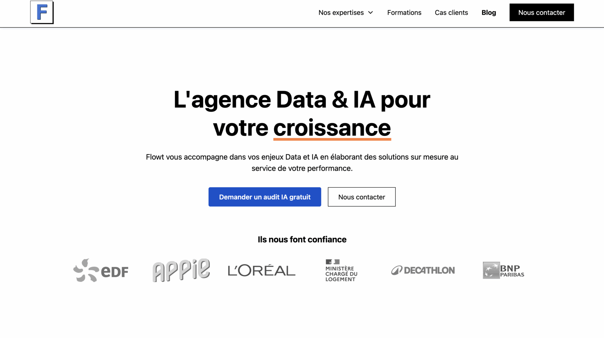 Flowt est une agence Data et IA. Elle accompagne les entreprises dans l’exploitation de leurs données, la création de solutions d’intelligence artificielle, l’automatisation de processus métier, et l’industrialisation de modèles data/IA.
