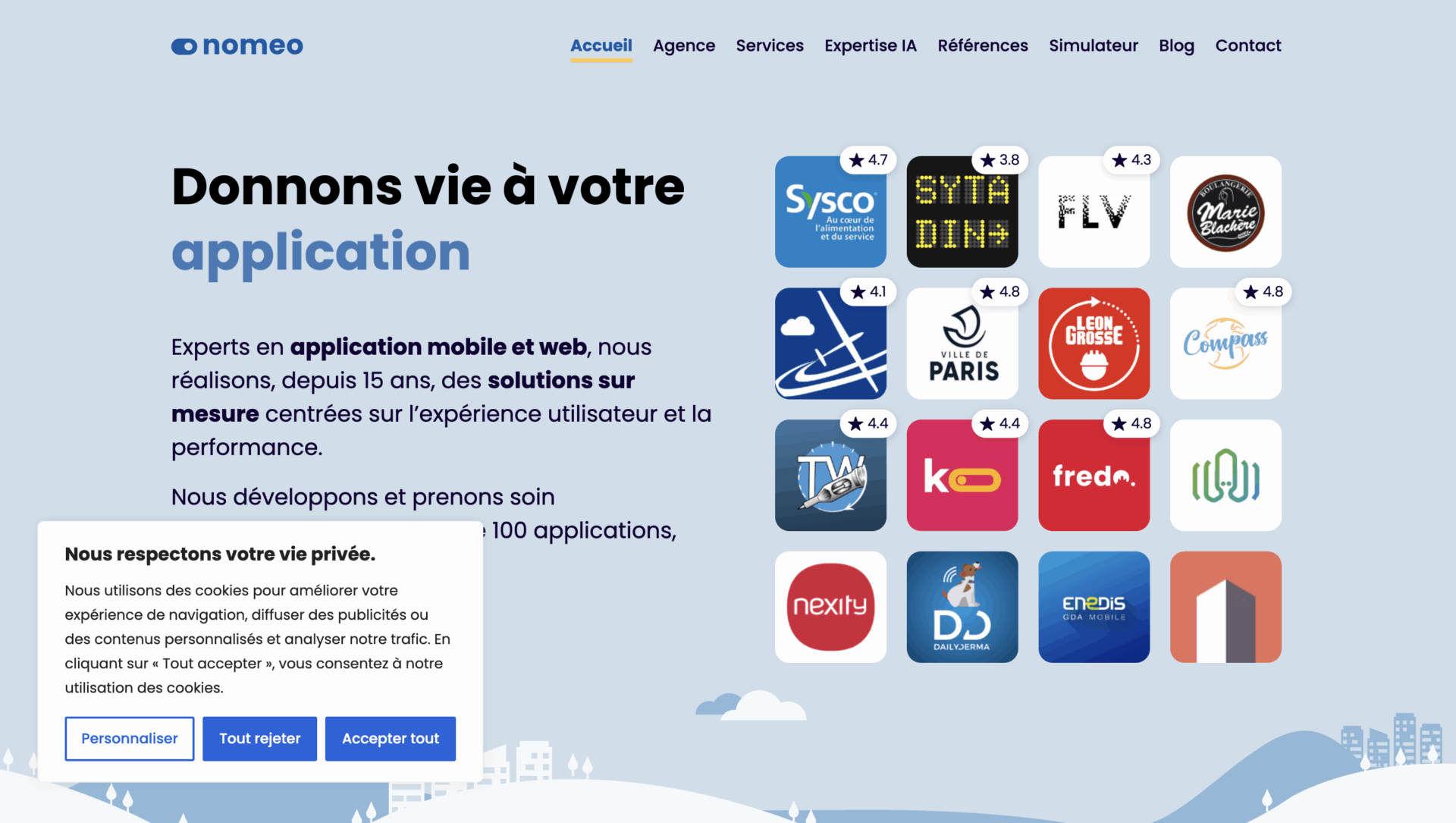 Nomeo est une agence digitale lyonnaise historique dans le développement d’applications mobiles et web, qui a récemment lancé une offre spécialisée en intelligence artificielle générative métier. Elle se positionne désormais comme un prestataire capable d’accompagner les entreprises dans la création d’agents IA sur-mesure, intégrés à leurs outils internes, pour automatiser des workflows métier. Sa proposition de valeur réside dans la combinaison de son savoir-faire technique (applications, UX/UI, intégrations) et d’experts IA dédiés, pour livrer des solutions opérationnelles rapidement, dans un cadre conforme (RGPD, sécurité) et évolutif.